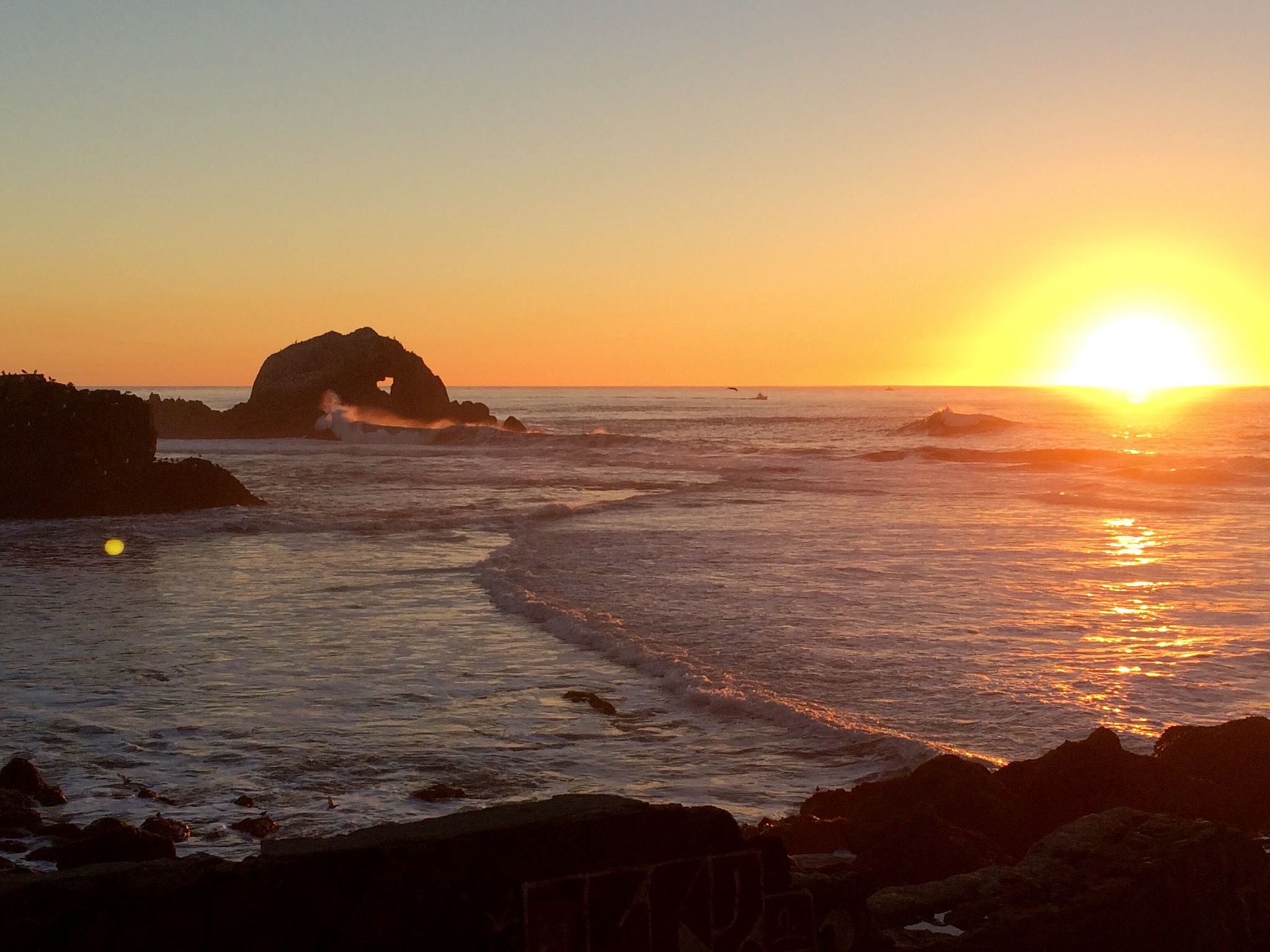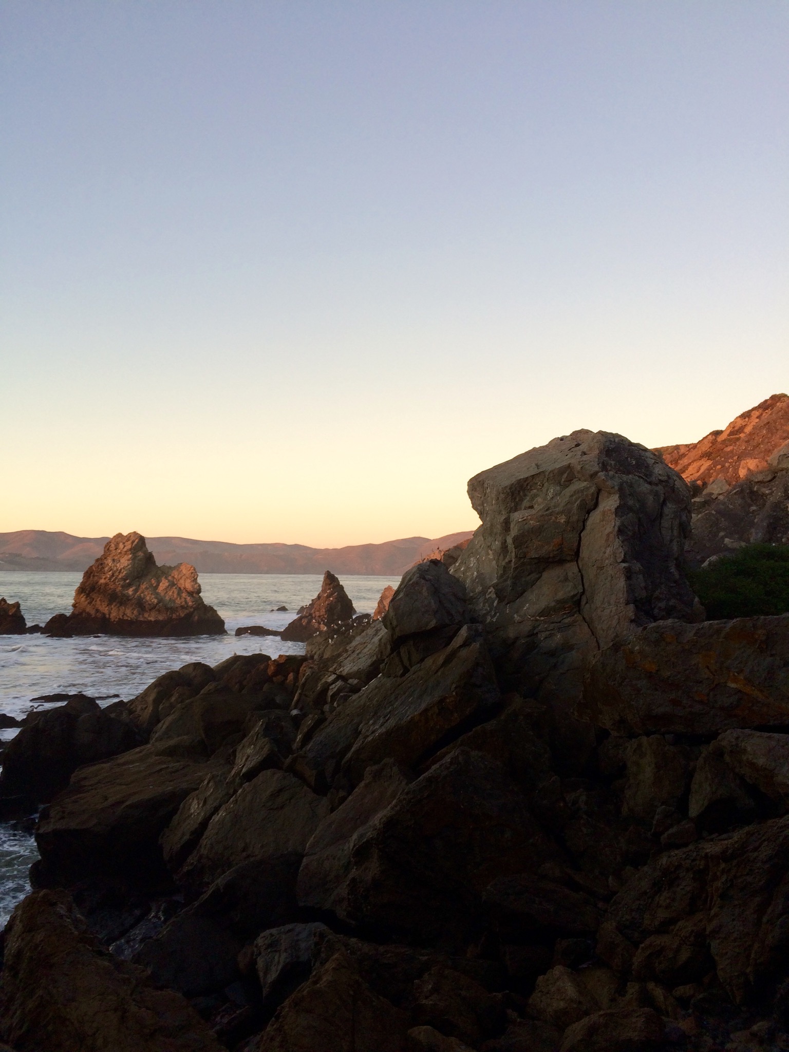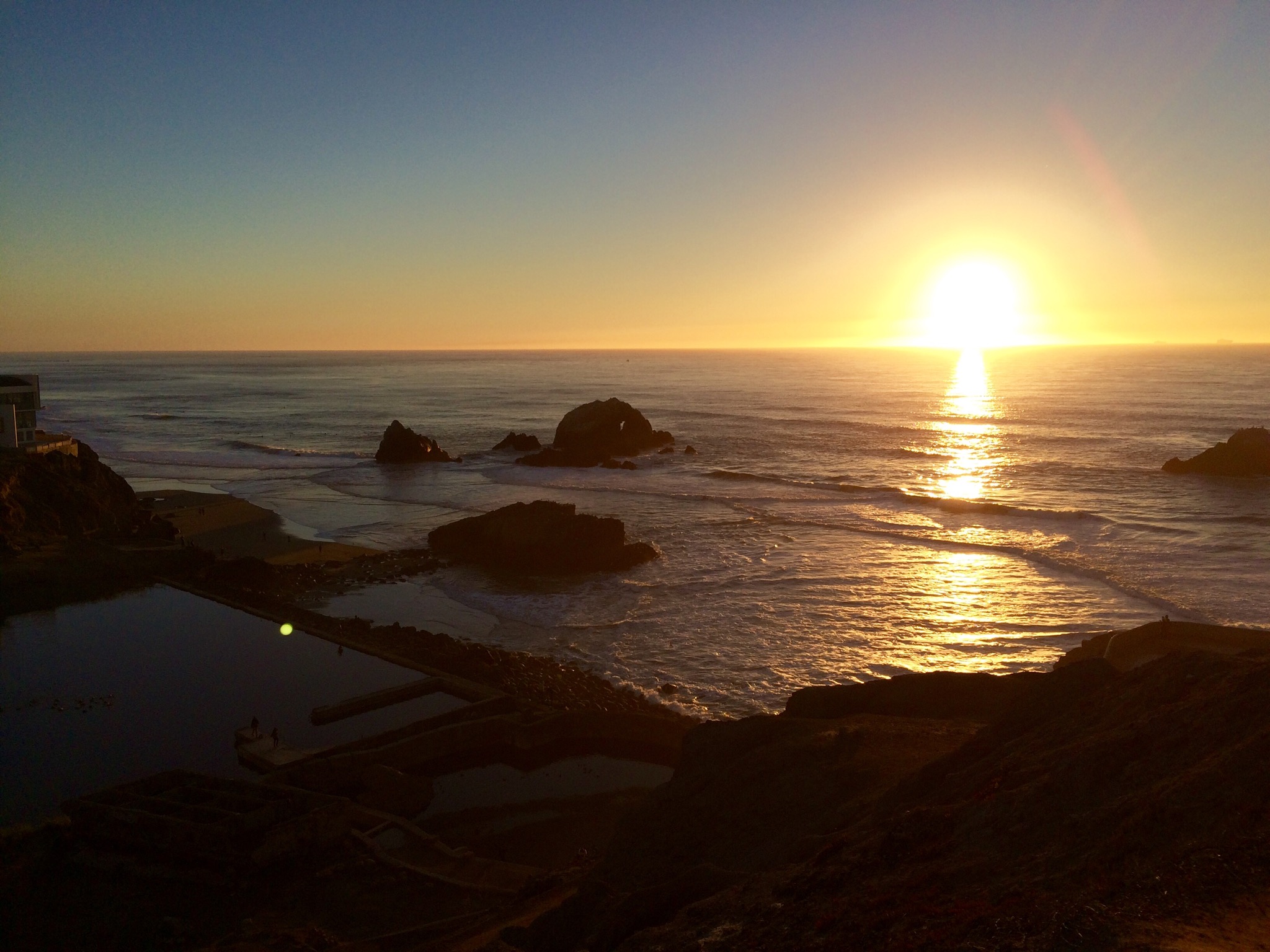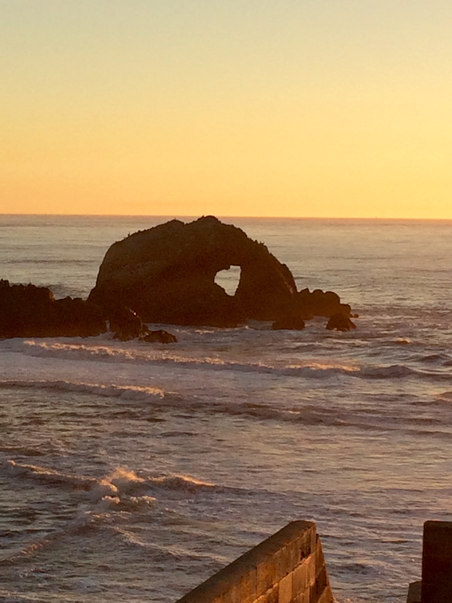 We started at the northwest end, walked the Sutro Ruins Trail to the Sutro Baths Upper Trail to the Lands End Coastal Trail circling back thru the Lincoln Park Golf Course (instead of walking through to Eagle’s Point Overlook) on the El Camino del Mar Trail before, finally settling back to the Sutro Baths Ruins. The air was significantly cooler, and the ground damp. We were surrounded by green, our only respite from it when the forest opened up on the left when the lush green gave way to the brilliant ocean blue. Our hike ended standing on an overlook into the Pacific Ocean. Rock formations all around jutting out of the waters as well as against the shore, five foot waves crashing towards land, its sounds music to my ears. We walked down the hill into and then out of the tunnel by Sutro to the sun setting into the horizon behind the ocean.